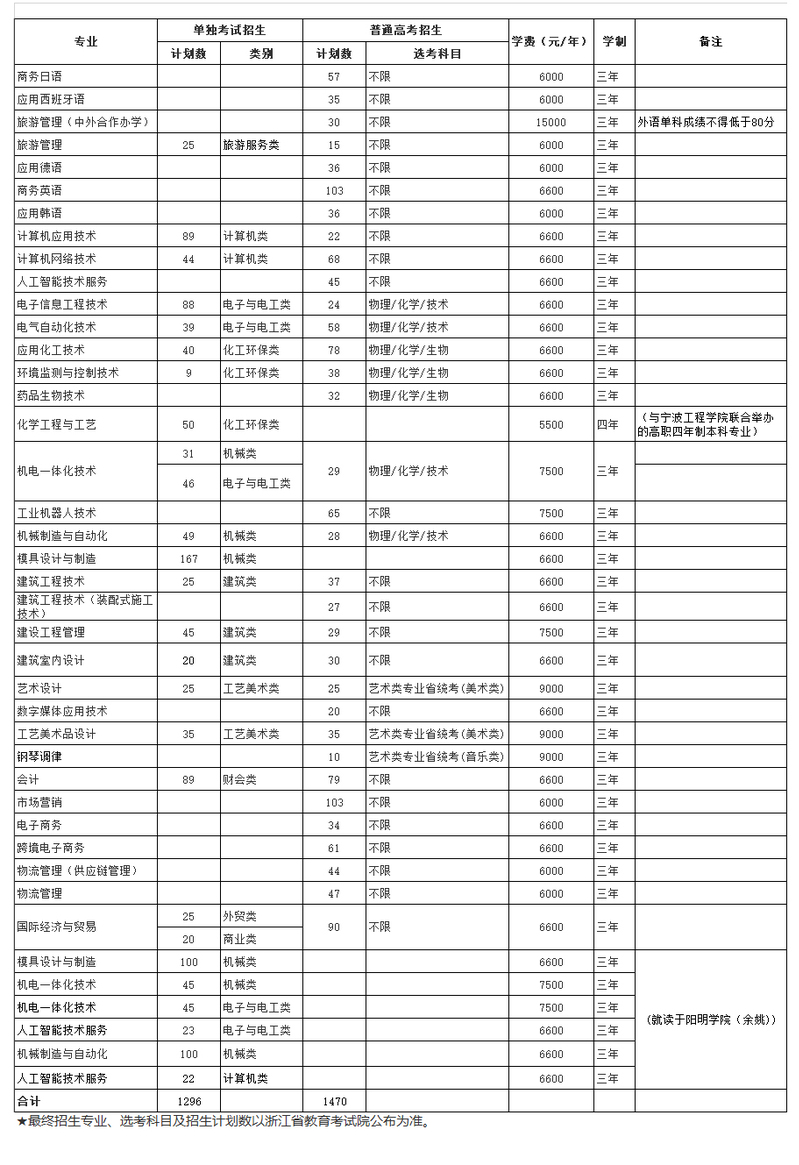 宁波职业技术学院2020年浙江省招生计划